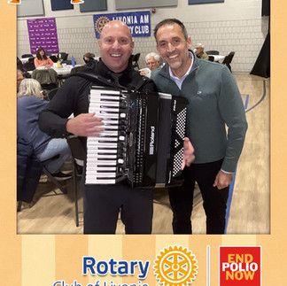 Once again, Deanna and Ron Gaffney, and Tammy Bonifield created a perfect spaghetti sauce, complemented by salad, bread, and delicious desserts donated by members of the Livonia AM Rotary Club and the Livonia (Noon) Rotary Club. Gluten-free options were available as well as carry-outs. Also new to this year was a roaming photo booth provided by Wayne Kinney from Rock Out Entertainment. Special thanks goes to Christ Our Savior Lutheran Church and Barbara Muldehour for hosting this gathering and letting us use their great kitchen. The crowd gave a loud cheer when the Churchill High School and the Stevenson High School Rotary Interact Clubs were called to the front of the hall and thanked for volunteering to help with the dinner. They looked a bit surprised when It was pointed out that they are our future leaders in the community.